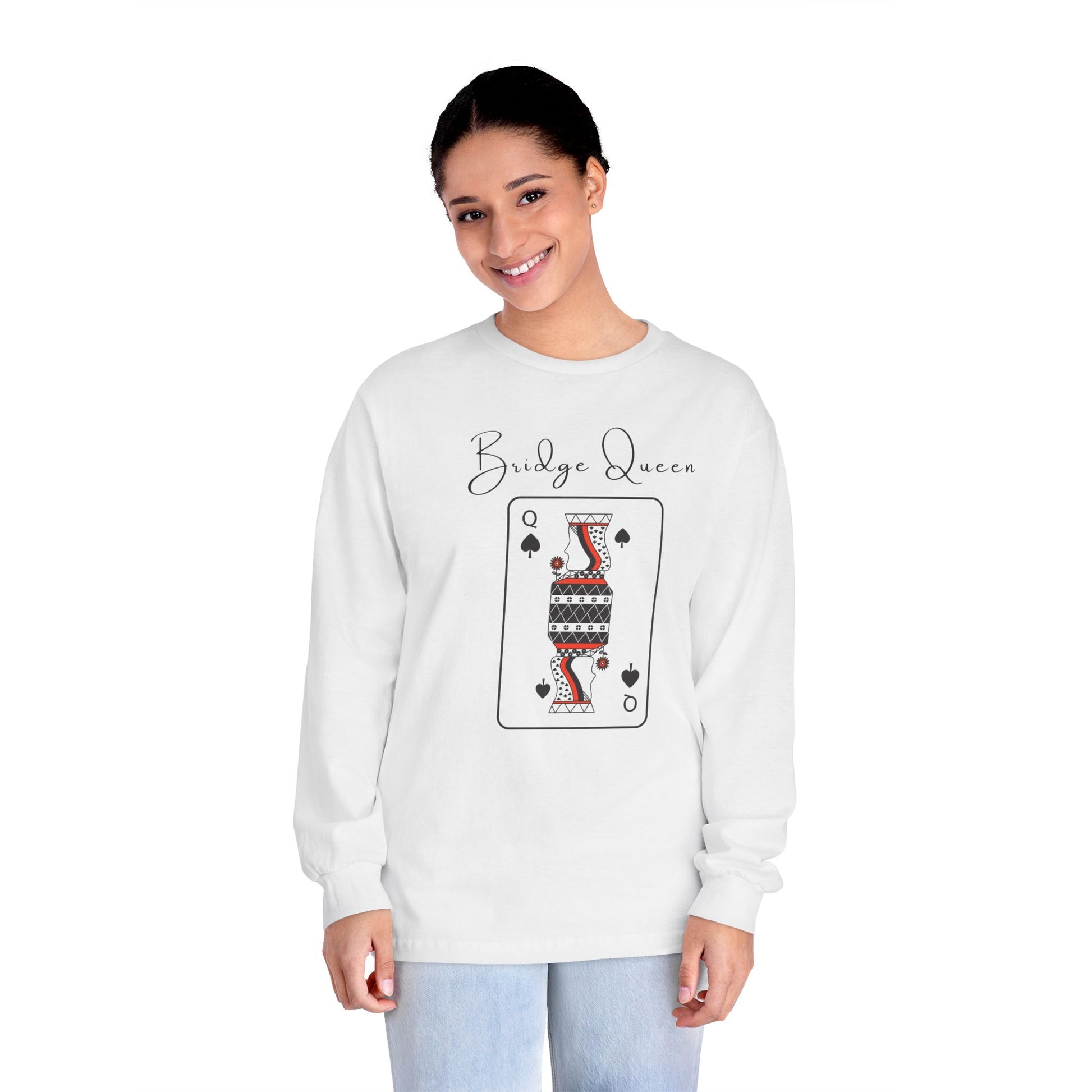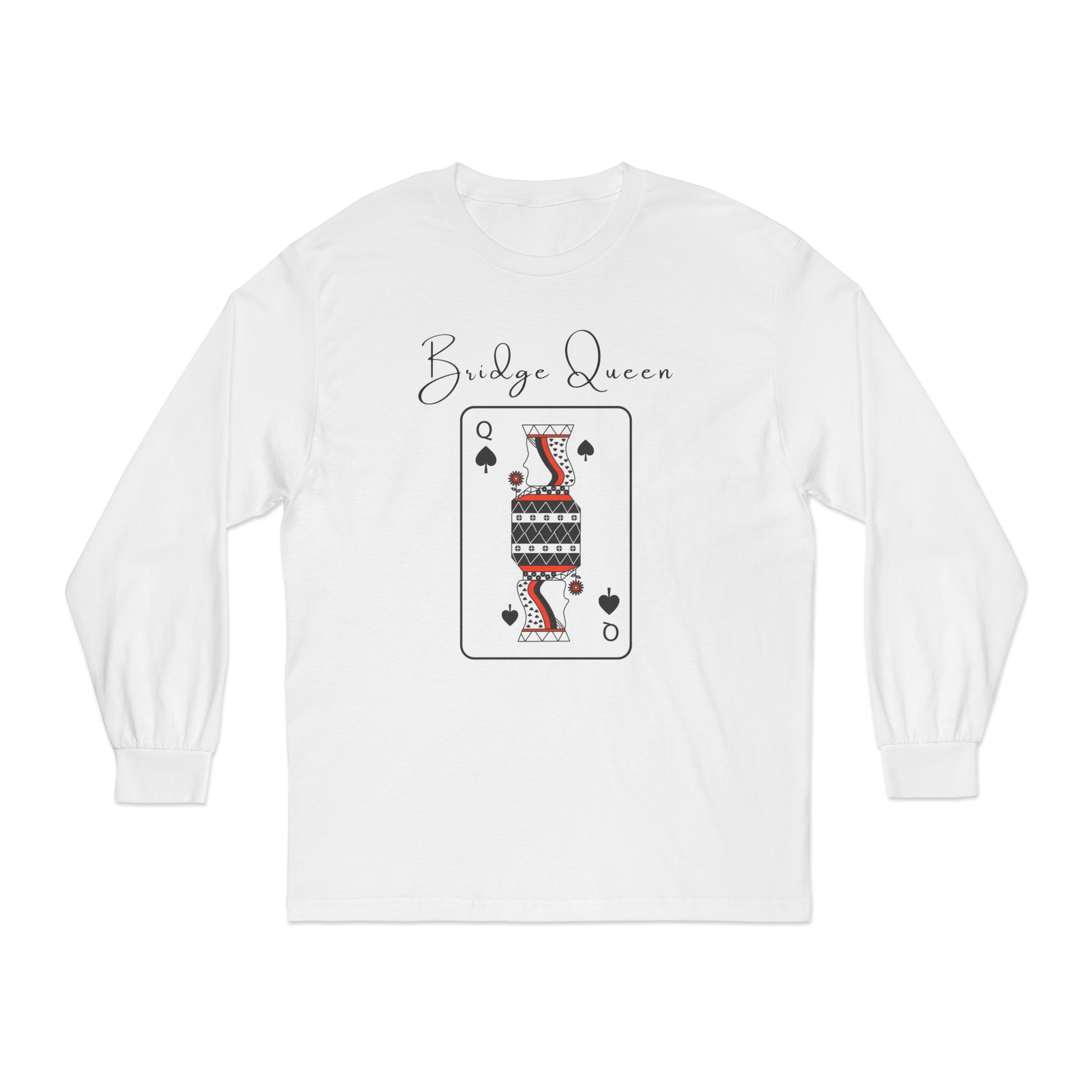 Elevate your style game with our Bridge Queen Tee! Perfect for card and bridge enthusiasts, this long sleeve white tee showcases a Queen of Spades design with the words "Bridge Queen". Show off your love for the game while looking effortlessly chic. A must-have addition to your wardrobe.
