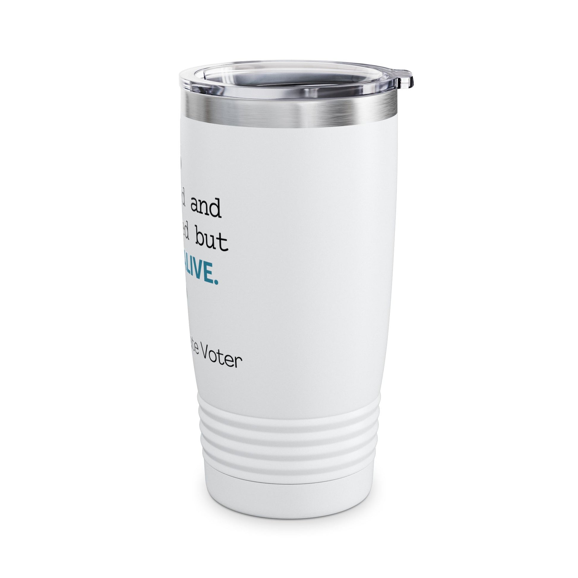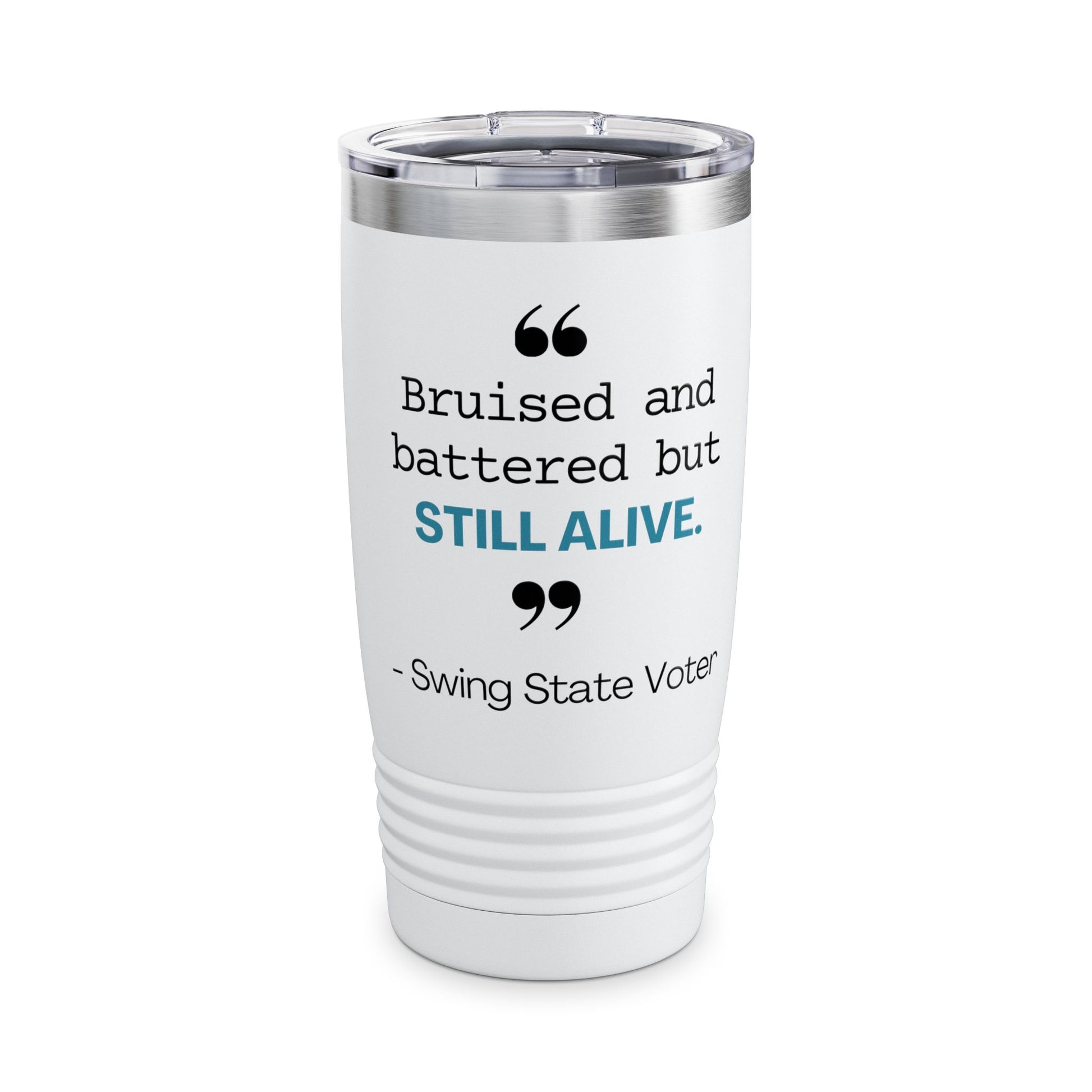 Celebrate resilience (and a good sense of humor) with our 20 oz insulated tumbler, featuring the statement design: "Bruised and Battered but Still Alive." Perfect for those who weathered the chaos in one of our battleground states. This tumbler is as tough as you are!
